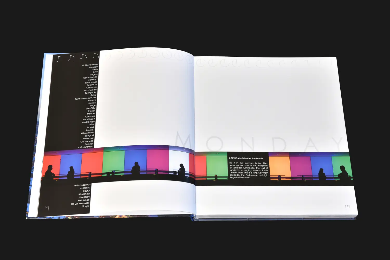 The book is structured around five fictional days spanning several time zones.